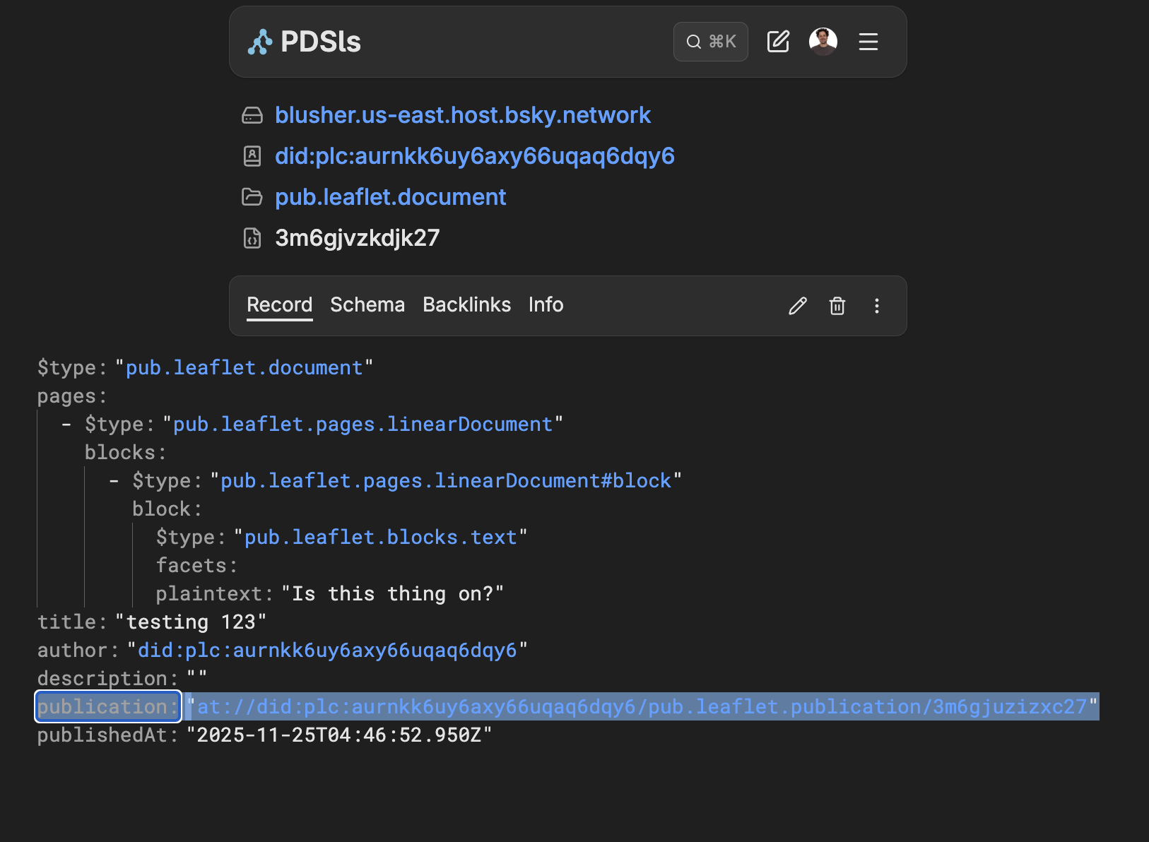 the 'publication/...' field for ALL my blog entries on latenthomer.leaflet.pub and it moved them over here, to jakesimonds.leaflet.pub. I think it worked? And the old links seem to work too? But wouldn't be surprised if I screwed something up.