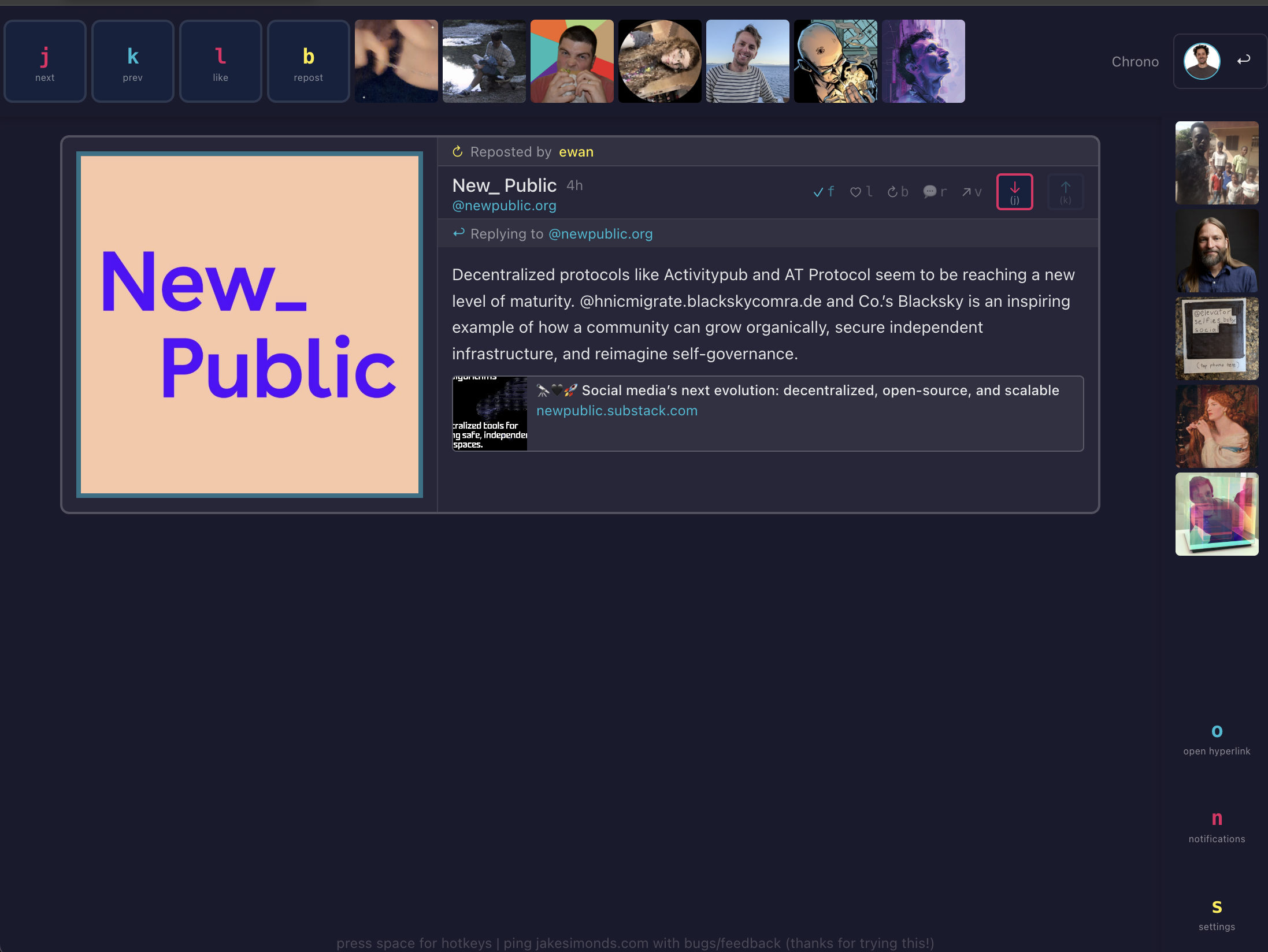 Keybindings were inspired by https://www.herocast.xyz/. Herocast is an awesome farcaster client, and using it I liked how different it felt than scrolling.